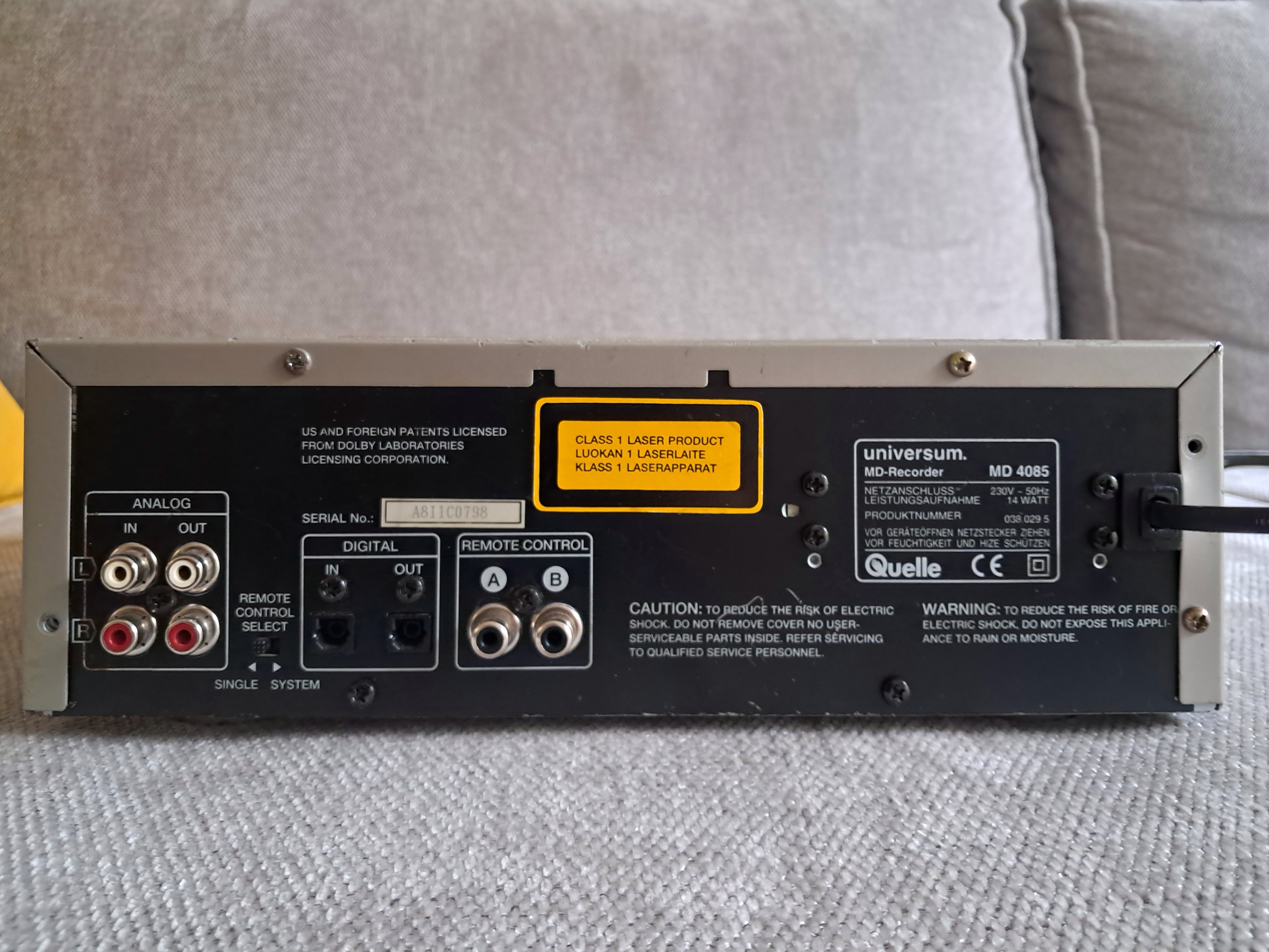 MD 4085 był częścią większego zestawu grającego 4085. W jego skład wchodził amplituner, odtwarzacz CD, radio FM, magentofon. Mój MD 4085 został kupiony na vintedzie za 60 zł z pięcioma minidiskami. Można powiedzieć, że był do nich gratisem. Z tego co się dowiedziałem, to poprzedni właściciel wyprzedawał rzeczy po śmierci mamy. Mama używała go do odtwarzania podkładów muzycznych, i faktycznie minidiski były ich pełne. Przyjechał do mnie mocno sfatygowany, porysowany, brudny i bez szybki na ekranie, ale sprawny. Wydrukowałem mu ramkę zasłaniającą dziury po szybce - żeby odrobinę mniej okropnie wyglądał, i nasmarowałem mu klapkę, bo się nie otwierała. Po tym zabiegu, działa idealnie. Niestety bez pilota, nie jestem w stanie sprawdzić pełnej jego funkcjonalności. Nigdzie też nie mogę znaleźć do niego instrukcji.